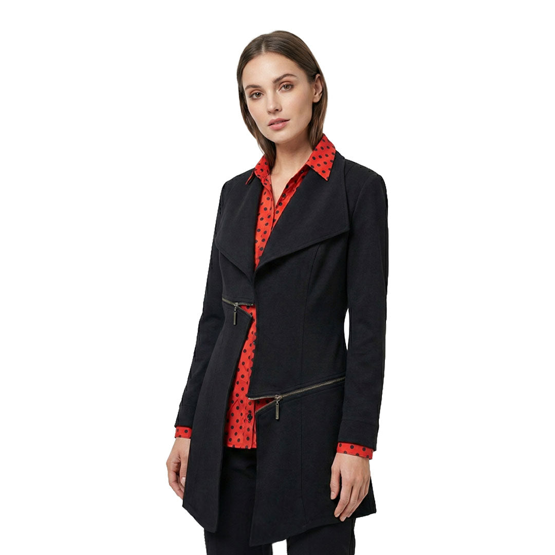 Zipper Trim Jacket is a modern & versatile outfit. A perfect complement to your fashion collection. Shown here in Black. Made in the USA Asymmetric zipper trim details Open...